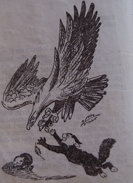 Krahët e fuqishëm,, sqepi i fortë, kthetrat e gjatë dhe të mprehtë e ndihmonin shumë shqiponjën: ajo çori lëkurën e maces dhe i kafshoi njërin sy. Macja nuk e humbi trimërinë, u ngjit te kthetrat e shqiponjës dhe i copëtoi me dhëmbë krahun e djathtë.